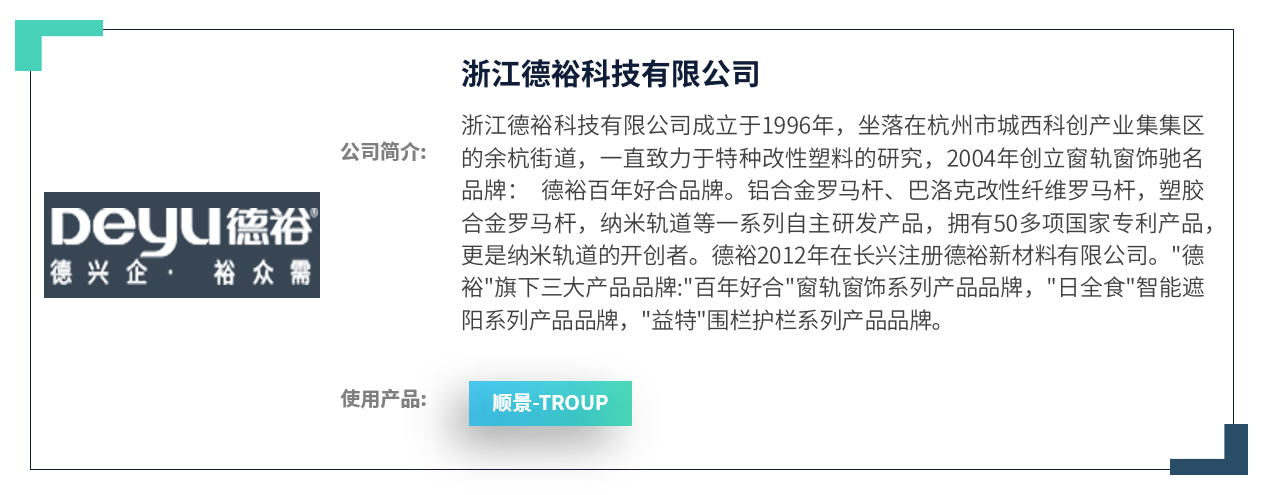 伴随着顺景ERP的成功上线,德裕的市场蒸蒸日上,一方面广德投资逾亿元的生产基地即将投入生产,另外一方面在湖州又投资成立了分子公司。进一步了完善了德裕的产品体系,使德裕进一步向下游产品发展打好了基础。