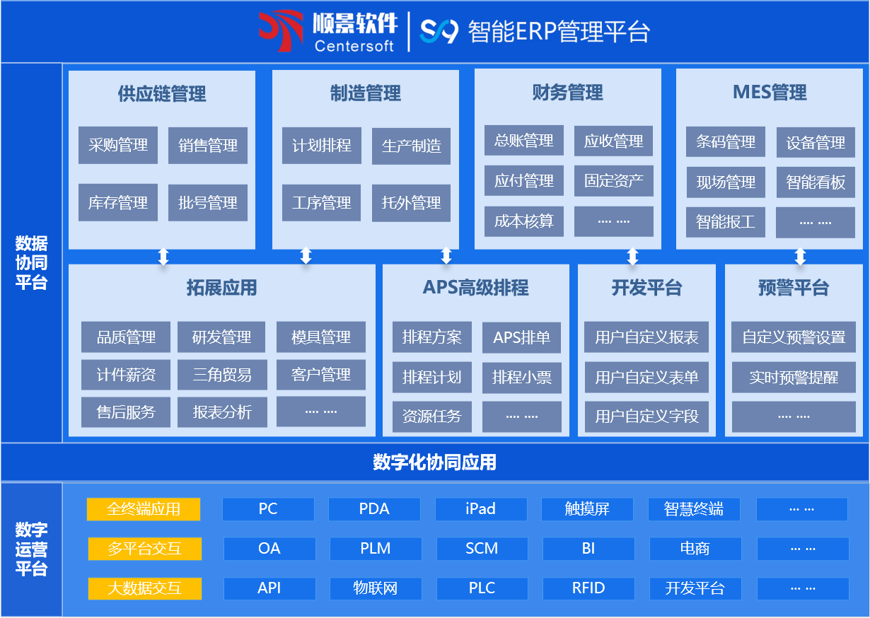 顺景S9 ERP系统,以制造为核心,将制造企业最核心的生产管理需求与供应链管理、财务管理相结合完美结合,打造以生产计划为核心的业务流+财务流一体化管理体系,提供了对企业信息化管理和数字化管理的核心模块:供应链管理、MRPII管理、生产制造管理、委外管理、财务管理、成本核算管理、人事薪资管理,品质管理,条码管理、智能看板,在这几大核心模块的支撑下,建立起企业数字化运营管理体系,及现代化高效协同工作的平台。