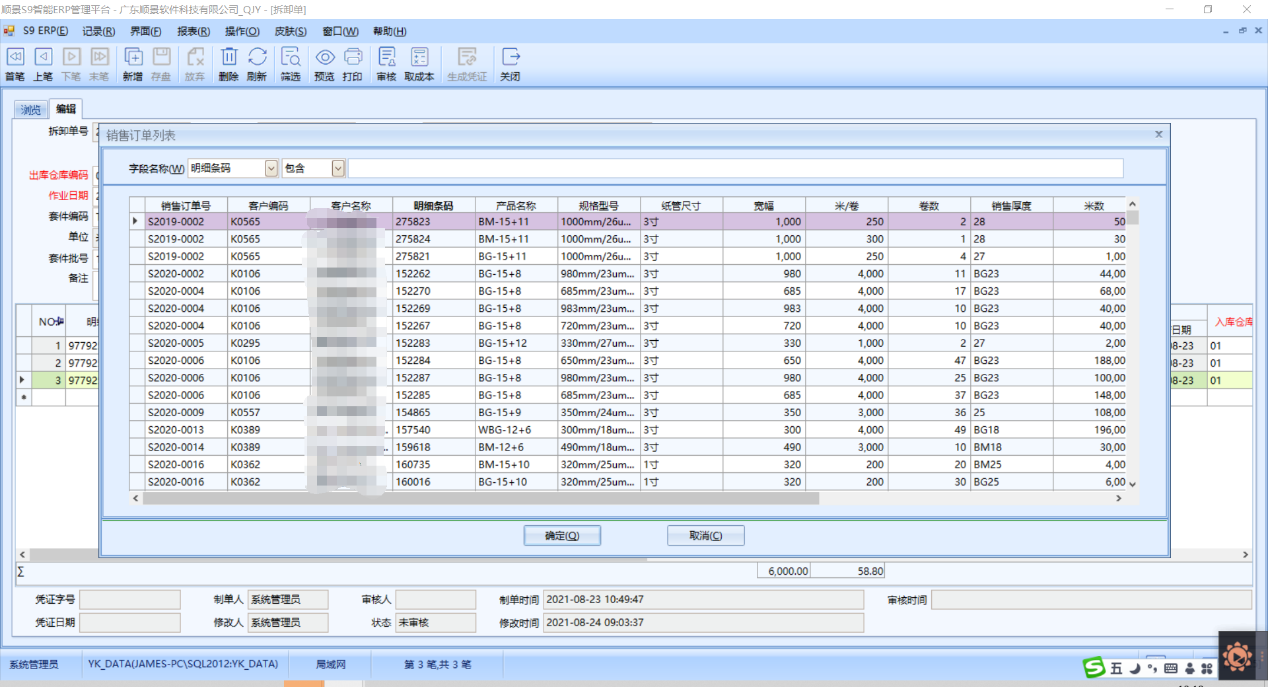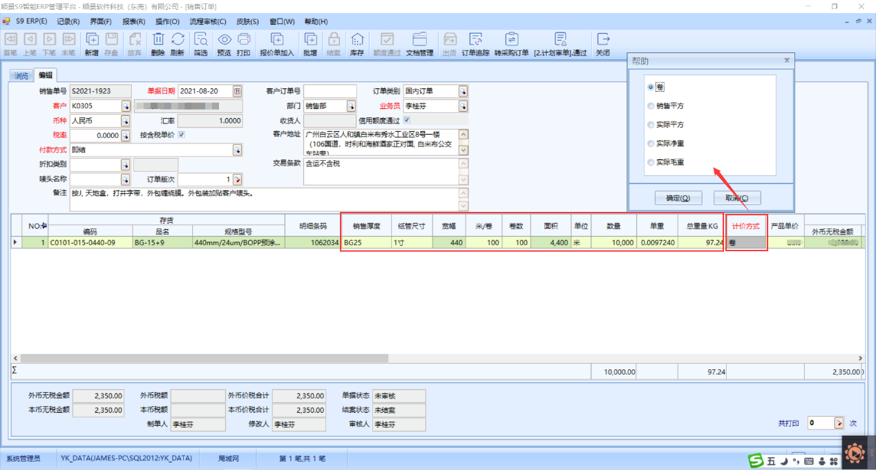 那针对业务下单这块单位不一致的问题,顺景ERP系统针对模切行业的应用特点,在销售模块针对性的做了一些定制开发,如新增一个计价方式、产品单价、卷数、米/卷等栏位,客户根据不同的计价方式填写不同的产品单价,系统会算出相应的总金额。比如,当计价方式选择为卷时,系统计算总金额的公式为产品单价*卷数,当计价方式为实际平方时,系统计算总金额的方式为产品单价*面积,当计价方式为实际毛重时,系统计算总金额的方式为产品单价*总重量栏位,且总金额栏位计算后系统会自动算出产品米数,并反算系统每米的单价。